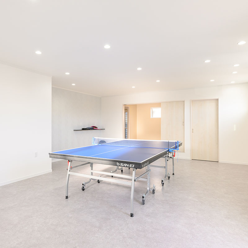 ベースカラーを統一し、温もりのある風合いに仕上げました。趣味の卓球ルームもこだわりのひとつ。